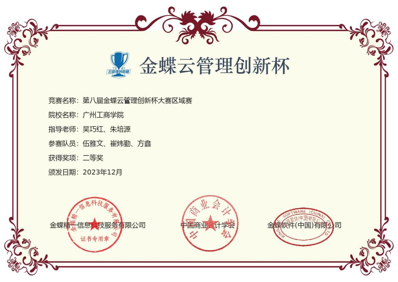 2023年12月10日,第八届金蝶云管理创新杯大赛华南区域赛在广州商学院举办,本次参赛队伍共计73组,其中ky开元集团官网学院会计学院共派出3支队伍参加。经过现场激烈的比赛争夺后,分别取得两组二等奖、一组三等奖的成绩。