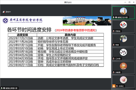 在线上讲座的最后,黄璐副教授展示了往年的毕业论文工作各环节时间进度安排,为会计学专业教研室各专任教师提供了毕业论文各工作时间节点的参考,同时也建议各专任教师可参考时间节点的进度安排,合理进行毕业论文的指导工作,并建议各专任教师在指导过程中有任何问题及时提出,学院协助解决。