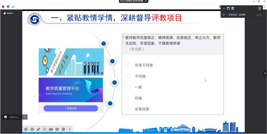 在紧贴教情学情,深耕督导评教项目以及厘清现状,客观认识主要问题方面,应教授详细介绍了督导评教的具体内容,让老师们清楚地了解督导评教项目,评教内容,强调上课时老师要仪表端庄,举止大方,备课是否充分,授课内容是否娴熟,教学目标是否符合要求,教学进度是否与大纲一致,教学内容是否丰富等都是督导在进行评教时重点关注的内容。授课时语言表达要清晰,逻辑性要强,上课时要抑扬顿挫,和学生要有情感交流。课上重难点内容的时间分配要合理,在授课中灵活运用现代教学手段的同时要有适当的板书,教学手段和教学内容要相契合,对于实践课在授课时老师要规范操作并进行积极耐心指导。此外教师在授课过程中不能照本宣科,可通过案例教学对学生进行启发式教学,课程思政也要融入到教学过程中,课程思政可以涉及到职业思想与职业道德教育等等。
