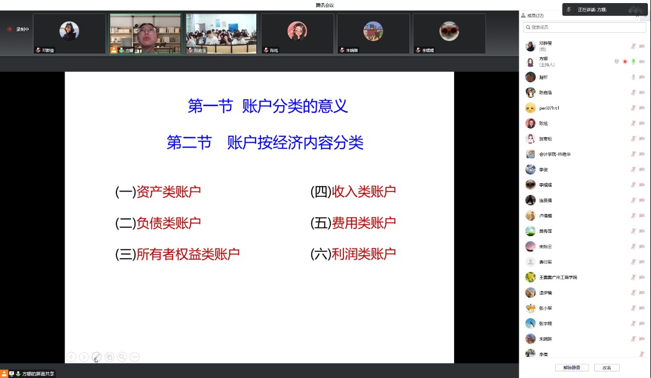 为进一步推进基础教育课程改革,加强教研引领,深化对教学的研究与实践,提高我会计学院教师的教学水平、创新能力和教学质量。会计学教研室于11月23日下午举行了教学观摩课活动,分别在线上和线下拉开了帷幕。本次活动由方娜老师主讲,主讲课程为《基础会计》,会计学院副院长周福萍教授、教研室主任邓晔莹老师、督导张秀霞教授等二十余位老师参与了本次活动。