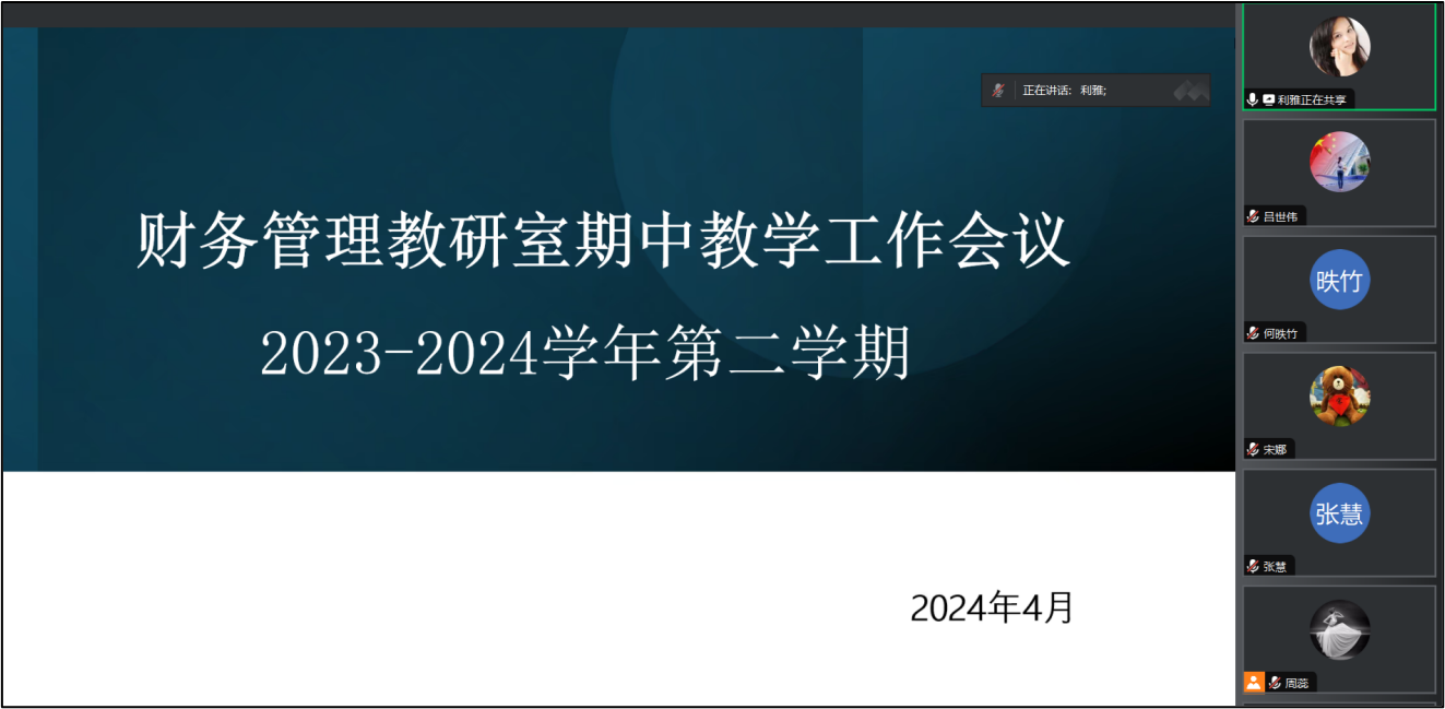 为了进一步提升教学质量和管理效率,财务管理教研室于2024年4月18日在线上召开了期中教学工作会议。会议由财务管理教研室周蕊副主任主持,参与会议的成员有财务管理教研室彭良军老师、专业负责人宋娜副教授、教研室主任利雅副教授、教学督导陈世文副教授和彭维湘副教授,以及财务管理教研室全体专任老师。
