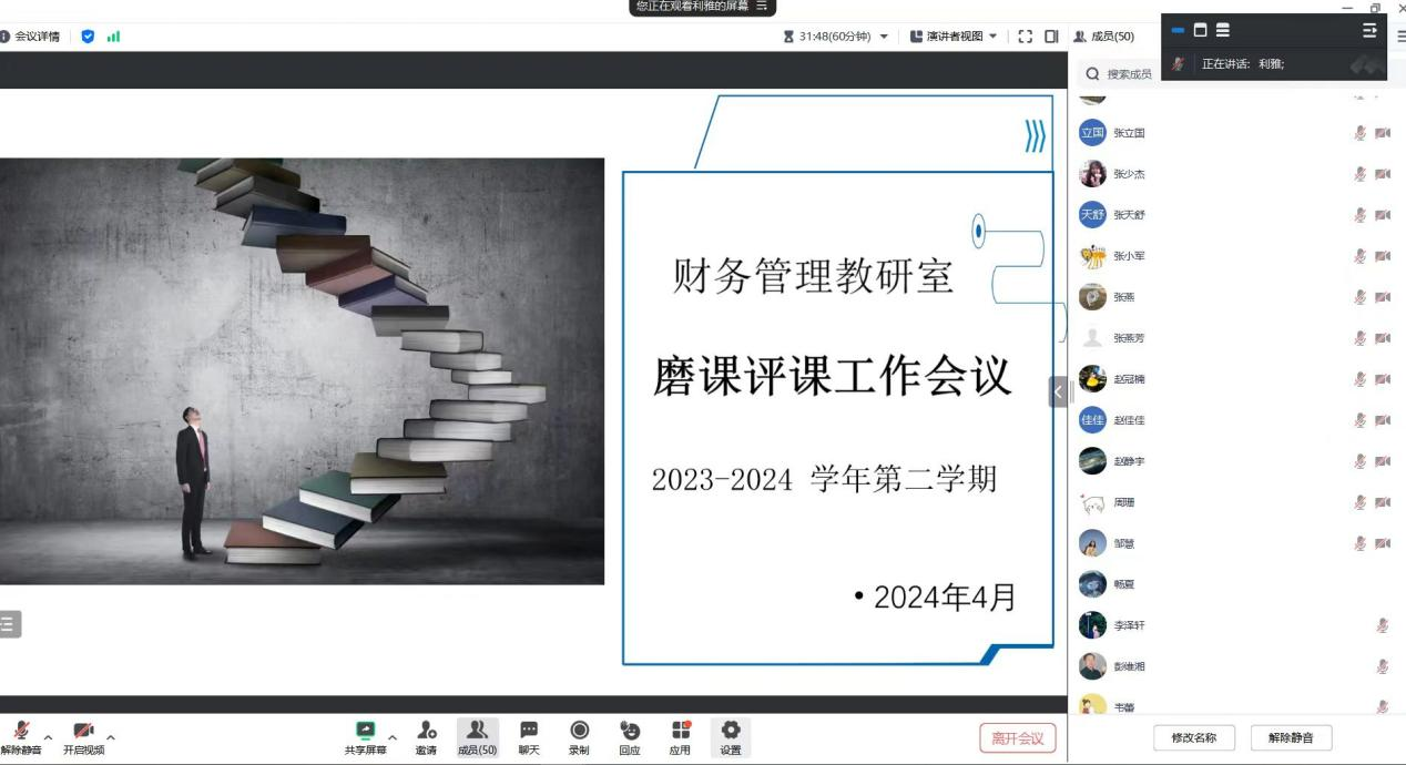 为进一步推动教育教学改革,提升财务管理专业的教学质量,财务管理教研室于4月1日至4月12日期间,通过安排高级职称教师随堂听课的方式开展了各课程组磨课活动,并于4月12日成功召开本次磨课的评课工作会议。会议旨在通过深入的研讨和交流,总结教学经验,优化教学方法,为培养高素质财务管理人才奠定坚实基础。本次会议由财务管理教研室周蕊副主任主持,财务管理教研室主任利雅副教授、会计学院督导何承文副教授、会计学院督导傅丽萍副教授以及财务管理教研室各个课程组全体成员齐聚一堂,共同探讨与交流。