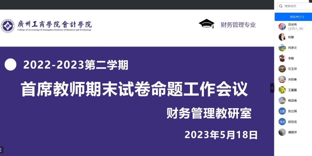 为做好期末课程考核工作,5月18日晚上9点,财务管理教研室组织召开了首席教师期末试卷命题线上会议。会计学院教工第二党支部组织委员、财务管理教研室主任利雅副教授,教研室副主任周蕊老师,教研室首席教师和课程组长参加了此次会议。会议由教研室主任利雅副教授主持。