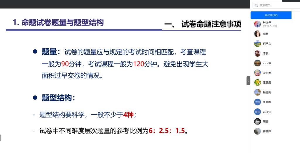 最后,利主任再次强调,期末考试命题工作非常重要,关系到教师的考评和学生的成绩。希望各位首席教师、课程组长严格按照学校课程教学大纲的要求,与课程组成员一起打磨出高质量期末试卷,保证期末试卷排版格式规范美观,共同做好期末试卷的命题工作,在命题中落实好学校规范制度。