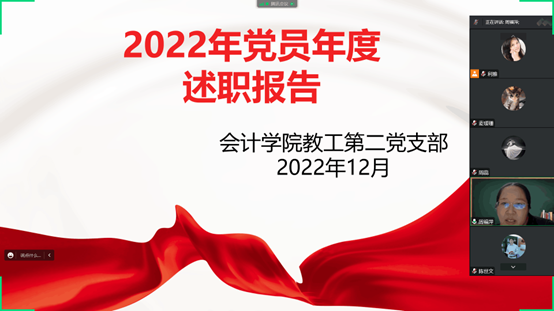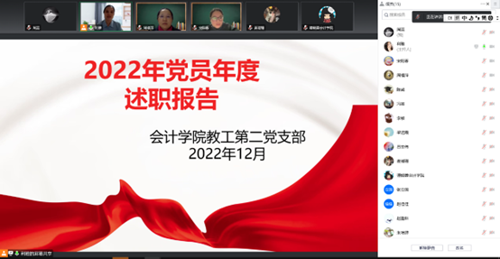 2022年12月12日晚上19:30,会计学院财务管理教研室组织教工第二党支部全体党员、入党积极分子、发展对象相聚云端,举行了一场年度述职报告会,会议由财务管理教研室主任、教工第二党支部组织委员利雅同志主持。