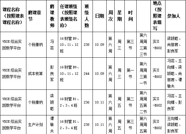 根据会计系开展“全员磨课、打造金课”活动的方案,第二阶段磨课时间为:2019年10月至2019年12月。《统计学》《管理会计》《财政学》《财务管理》《VBSE综合实践教学平台》《会计信息系统》《审计学》《会计学》等12个课程组,按规定计划开展了磨课、评课、互评、总结等一系列活动。现根据实际情况汇报磨课总结如下:
