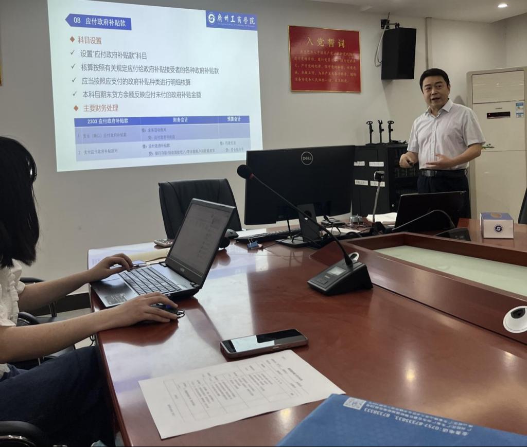 4月15日上午,会计学院开展“行政事业单位负债”主题磨课活动,落实“新文科”建设要求,提升《政府及非营利组织会计》课程的实践性与思政融合深度。本次课由资深教师刘若鸿主讲,学院领导班子成员、教研室主任、副主任、专业负责人、课程组长黄启操、课程组内老师李丽媚等参与观摩。课程聚焦第四章内容,采用“理论解析—流程演示—案例研讨—思政浸润”教学模式,引导学生掌握政府负债核算逻辑与法规要求,培养“懂制度、精核算、守伦理”的公共财务人才。
