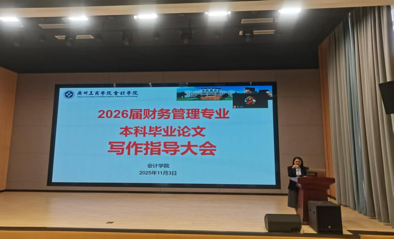 为扎实推进2026届财务管理专业本科毕业论文工作,提升学生论文写作质量与学术规范意识,2025年11月3日,会计学院财务管理专业在三水校区第四综合楼学术报告厅隆重举行了“2026届财务管理专业本科毕业论文写作指导大会”。会计学院科研副院长高少慧、财务管理教研室主任宋娜、副主任杨瑾及2026届财务管理专业全体学生参加了本次大会。