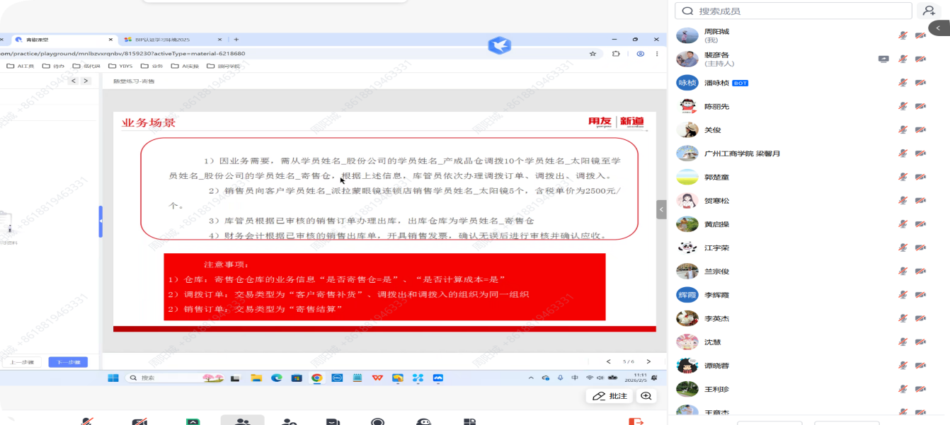 实操演练环节是本次线上培训的核心亮点。新道科技为参训教师搭建了专属线上模拟企业实训环境,参训教师以“企业供应链管理员”的角色,完成全流程实操练习。为期三天的培训中,第一天(2月3日)聚焦系统建模,完成组织管理、业务类及财务类基础数据搭建与实训;第二天(2月4日)深耕采购管理,实操常规与特殊采购业务流程;第三天(2月5日)推进库存、销售管理及内部交易实操,涵盖转库、调拨、销售退货补货等重点任务。裴彦各讲师针对教师在操作中遇到的难点问题,通过线上屏幕共享、实时答疑、步骤拆解等方式开展全面指导,并结合教学场景,分享了如何将实操任务转化为课堂教学案例,如何设计分层式实训项目以满足不同基础学生的学习需求。