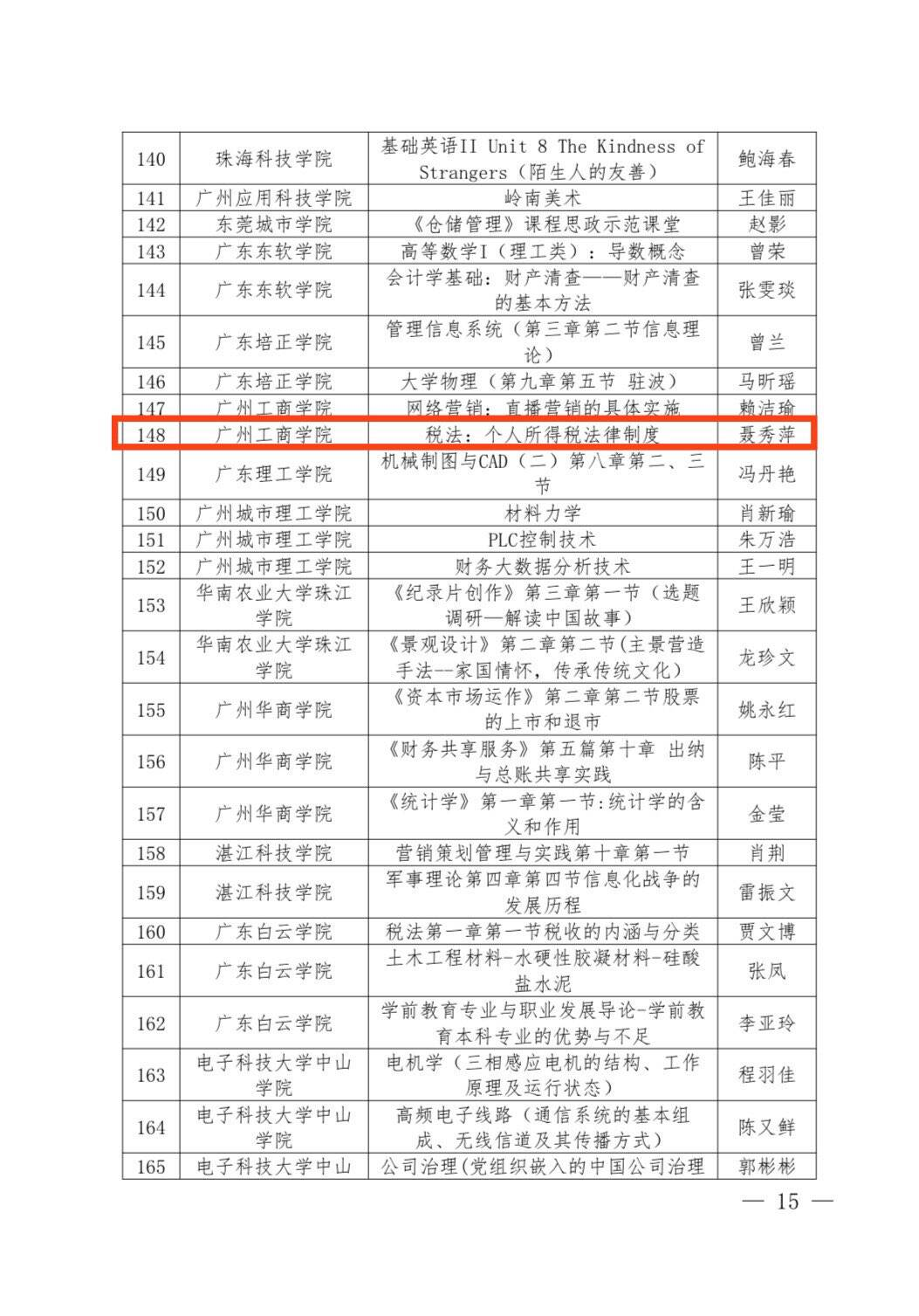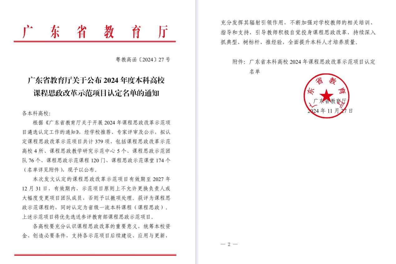 根据广东省教育厅发布的《广东省教育厅关于公布2024年度本科高校课程思政改革示范项目认定名单的通知》,会计学院聂秀萍教授主持的《税法:个人所得税法律制度》被认定为省级课程思政示范课堂。