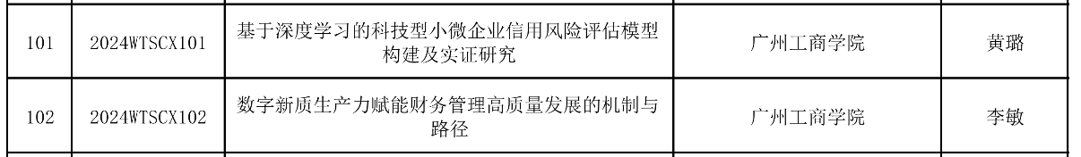 根据《广东省教育厅关于公布 2024 年度普通高校认定类科研项目立项名单的通知》,我院黄璐副教授士主持的《基于深度学习的科技型小微企业信用风险评估模型构建及实证研究》和李敏副教授主持的《数字新质生产力赋能财务管理高质量发展的机制与路径》成功获批立项。