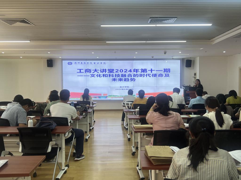 2024年6月20日下午,工商大讲堂2024年第十一期学术讲座在三水校区院部楼525会议室如期举行。该讲座由会计学院主办,邀请广东省社会科学院原党组成员、副院长温宪元二级研究员担任主讲嘉宾。讲座主题为“文化和科技融合的时代使命及未来趋势”。会计学院副院长高少慧博士主持讲座,会计学院百余名教师参加讲座。