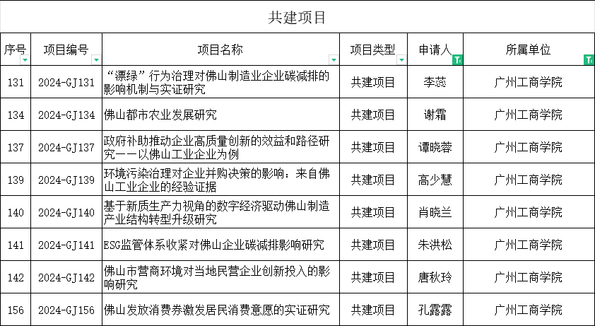 立项的项目分别为高少慧博士主持的《环境污染治理对企业并购决策的影响:来自佛山工业企业的经验证据》、谭晓蓉副教授主持的《政府补助推动企业高质量创新的效益和路径研究——以佛山工业企业为例》、谢霜老师主持的《佛山都市农业发展研究》、肖晓兰老师主持的《基于新质生产力视角的数字经济驱动佛山制造产业结构转型升级研究》、李蕊老师主持的《“漂绿”行为治理对佛山制造业企业碳减排的影响机制与实证研究》、唐秋玲老师主持的《佛山市营商环境对当地民营企业创新投入的影响研究》、孔露露老师主持的《佛山发放消费券激发居民消费意愿的实证研究》以及朱洪松老师主持的《ESG监管体系收紧对佛山企业碳减排影响研究》。