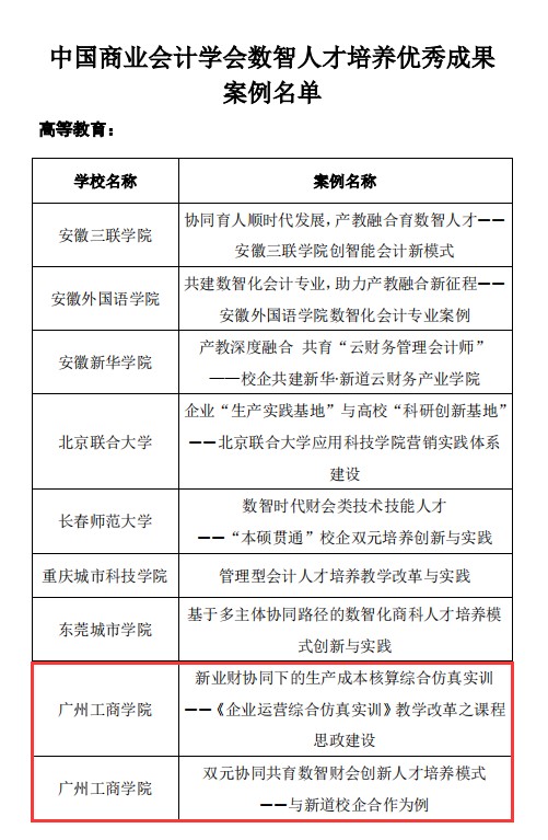 近日,中国商业会计学会公布了数智人才培养优秀成果案例名单,会计学院两项案例入选为优秀成果案例,分别是会计学院院长任道纹教授主持的《双元协同共育数智财会创新人才培养模式——与新道校企合作为例》、会计学教研室主任邓晔莹主持的《新业财协同下的生产成本核算综合仿真实训——<企业运营综合仿真实训>教学改革之课程思政建设》。