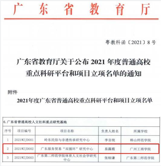 近日,广东省教育厅发布了《广东省教育厅关于公布2021年度普通高校重点科研平台和项目立项名单的通知》(粤教科函〔2021〕8号),ky开元申报的《广东服务贸易“双循环”研究中心》获批为广东省普通高校人文社科重点研究基地,负责人为易露霞副校长。广东服务贸易“双循环”研究中心是ky开元首个广东省普通高校人文社科重点研究基地,是ky开元科研平台建设的重大突破。