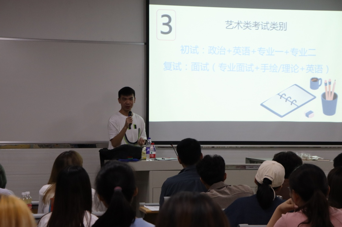 本次讲座主讲人为陈杰和林志荣老师,首先陈杰老师由表及里深层次解析艺术类学生考研的整体情况,详细解释了“为什么考研”,透过举例和分析不同学校历届的录取分数线,鼓励大家确定自己的目标,让同学们更加认清当前的考研形式。接着,林志荣老师分析正确的考研心态,如何选择报考学校及专业,结合自己备考的经验进一步分析提高考研分数的技巧,分享相关考研复习资料的免费资源,同时提出了很多有关备考的建议。