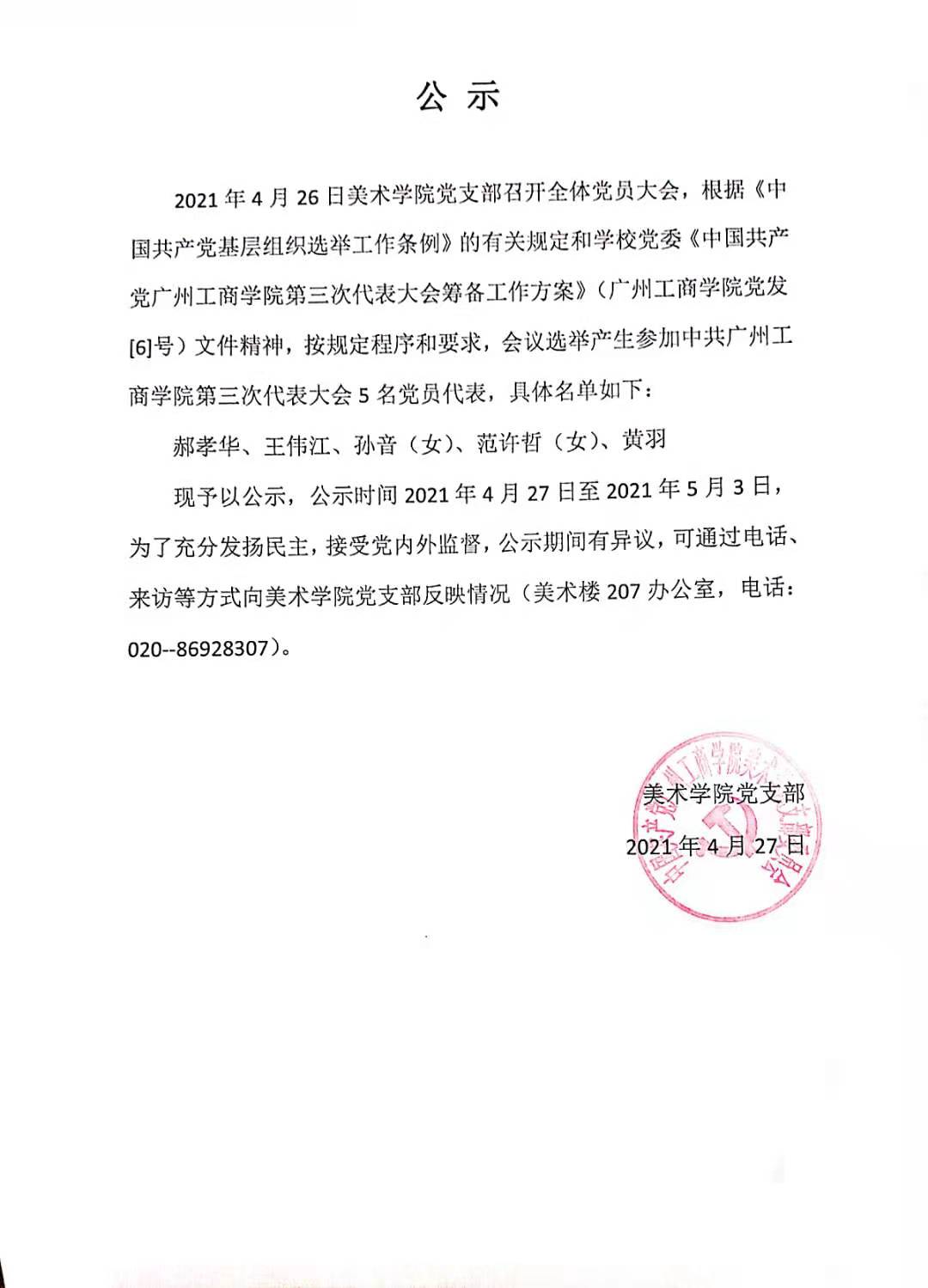 现予以公示,公示时间2021年4月27日至2021年5月3日,为了充分发扬民主,接受党内外监督,公示期间有异议,可通过电话、来访等方式向美术学院党支部反映情况(美术楼207办公室,电话:020--86928307)。