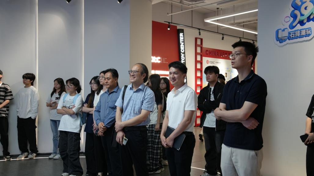9时30分,调研团队抵达石排潮玩中心,在石排镇人力资源和社会保障局副局长陈计波、潮玩办副职王慧玲及企业代表陪同下,开启沉浸式产业调研。师生一行在潮玩中心展厅、扭蛋基地近距离观摩潮玩IP设计、潮玩产品的终端销售场景与消费者互动模式,展厅内陈列的限量款手办、盲盒及潮玩IP衍生品,展现了从设计开发到生产落地的全产业链流程。
