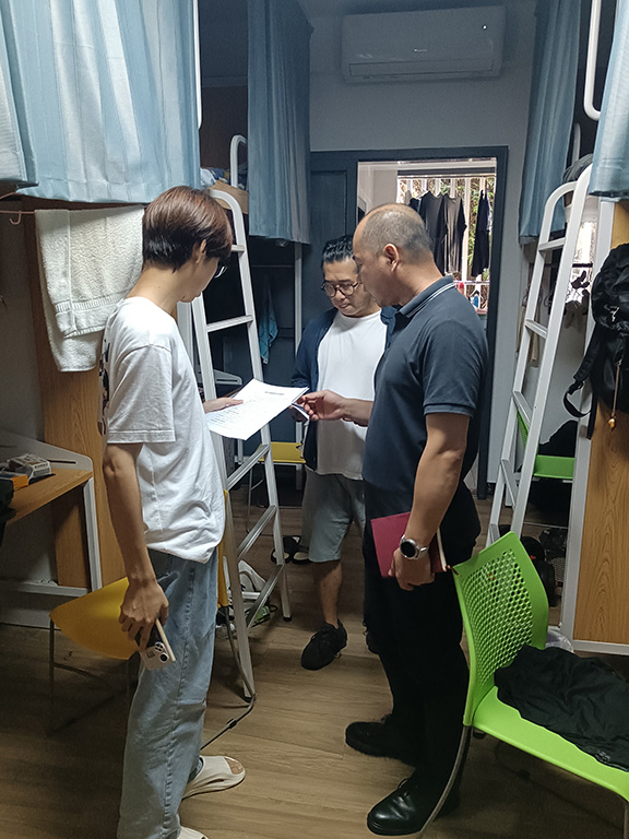 王伟江副院长则针对夏季安全特点,提醒学生保持宿舍通风防潮,及时清理杂物消除火灾隐患。走访团队还对各宿舍通风、用电线路等进行了实地检查,对发现的问题现场提出整改意见。