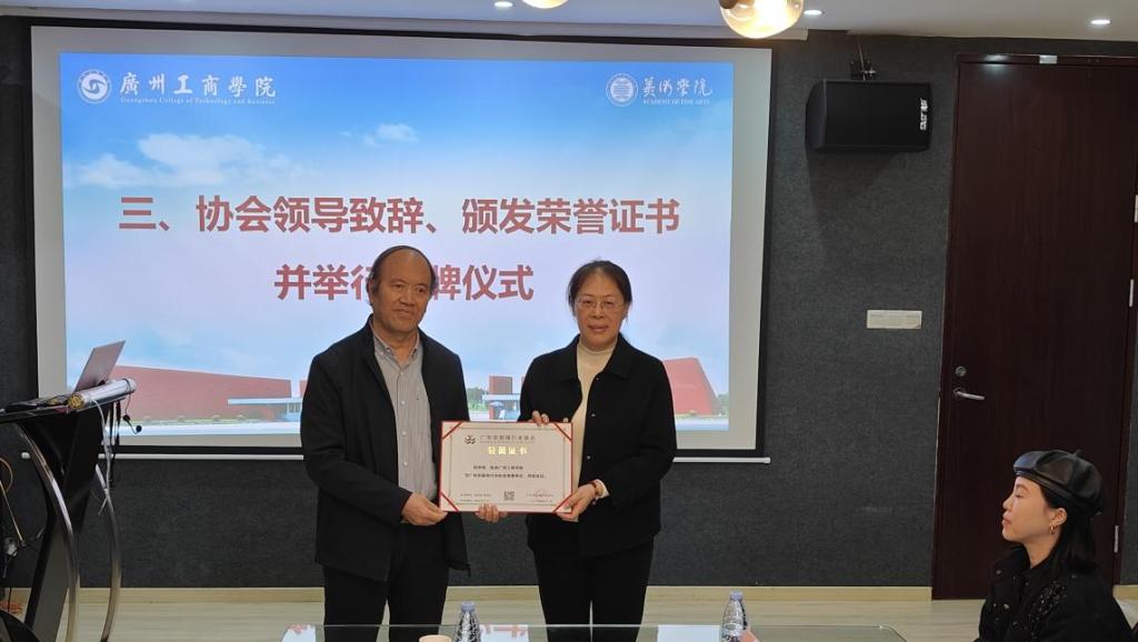 随后,广东省装饰行业协会秘书长郭爽发表致辞,对美术学院在装饰设计与教育领域的杰出贡献予以高度赞扬。她强调,当前装饰行业正处在转型升级的关键时期,院校作为人才培养与技术研发的核心基地,与协会的深度合作将有效贯通“产学研用”的完整链路,有力推动行业转型发展。致辞结束后,郭爽秘书长代表协会向美术学院颁发了“理事单位”荣誉证书及牌匾。授牌仪式庄重而热烈,现场掌声雷动,将活动氛围推向了高潮。