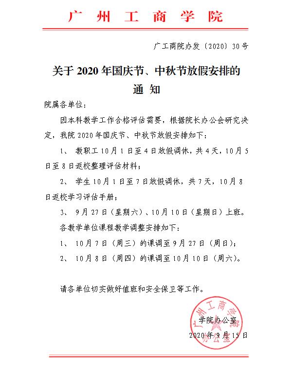 关于2020年国庆节、中秋节放假安排的通知