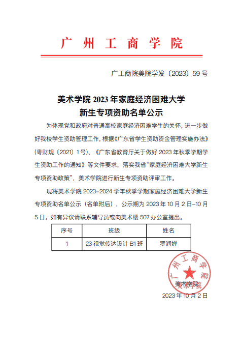 美术学院2023年家庭经济困难大学新生专项资助名单公示