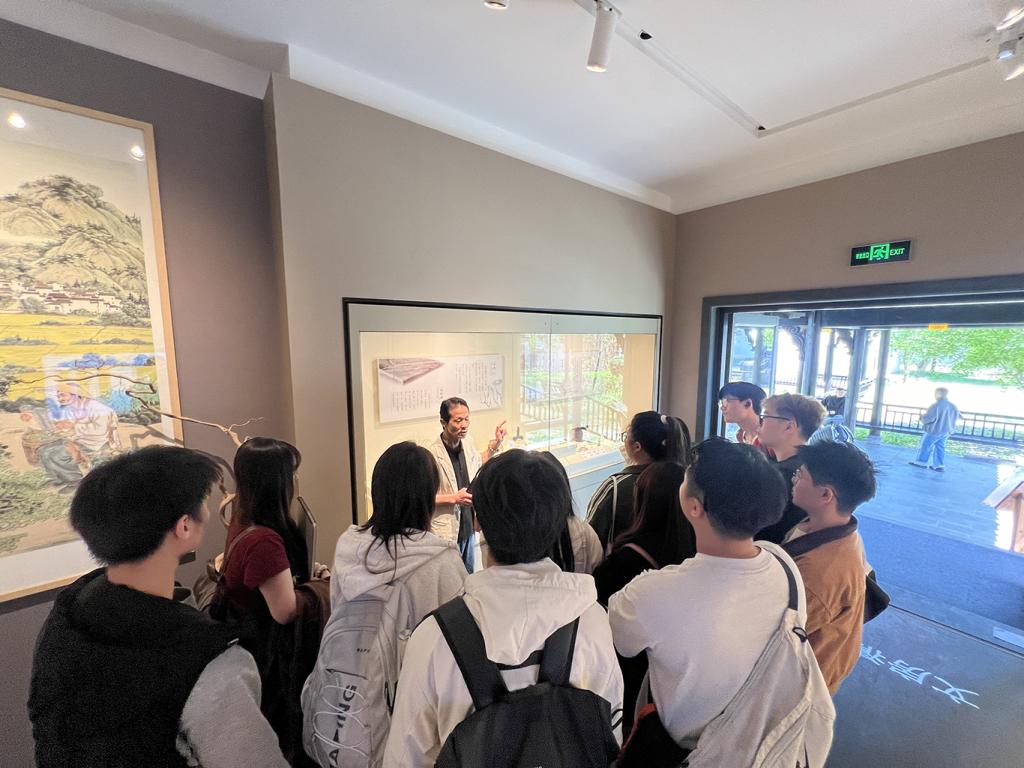 在江湾古镇参观中,教师带领学生一行参观了婺源民俗博物馆,参观中教师团队着重引导学生关注传统民俗文化中装饰性视觉符号体系。砖雕木刻的吉祥纹样、楹联匾额的书法气韵,成为学生探讨"如何让传统文化符号适配现代视觉语境"的实践案例。徽州三雕的蝙蝠纹样寓意“福气”,若将其几何化处理后融入现代包装设计,既能保留文化内涵,又能符合年轻消费群体的审美偏好。参观过程中工作人员从中式美学到地方特色进行了详细的介绍,使得学生对于当地传统美学有了更进一步的认知,随后在博物馆文创市集中同学们也感受到了传统美学与现代设计融合的实践应用,为后续课程的学习奠定了基础。
