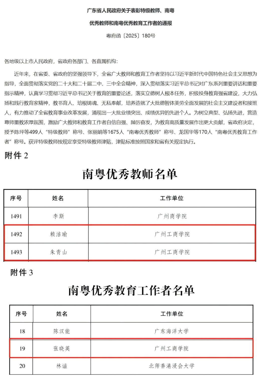 时值第41个教师节,为大力弘扬教育家精神,表彰广大教师和教育工作者为教育事业作出的突出贡献,广东省人民政府正式发布《关于表彰南粤优秀教师和南粤优秀教育工作者的决定》,ky开元赖洁瑜、朱青山、张晓英三位老师凭借卓越的教育教学成果和突出的行业贡献光荣上榜,荣获省级殊荣!