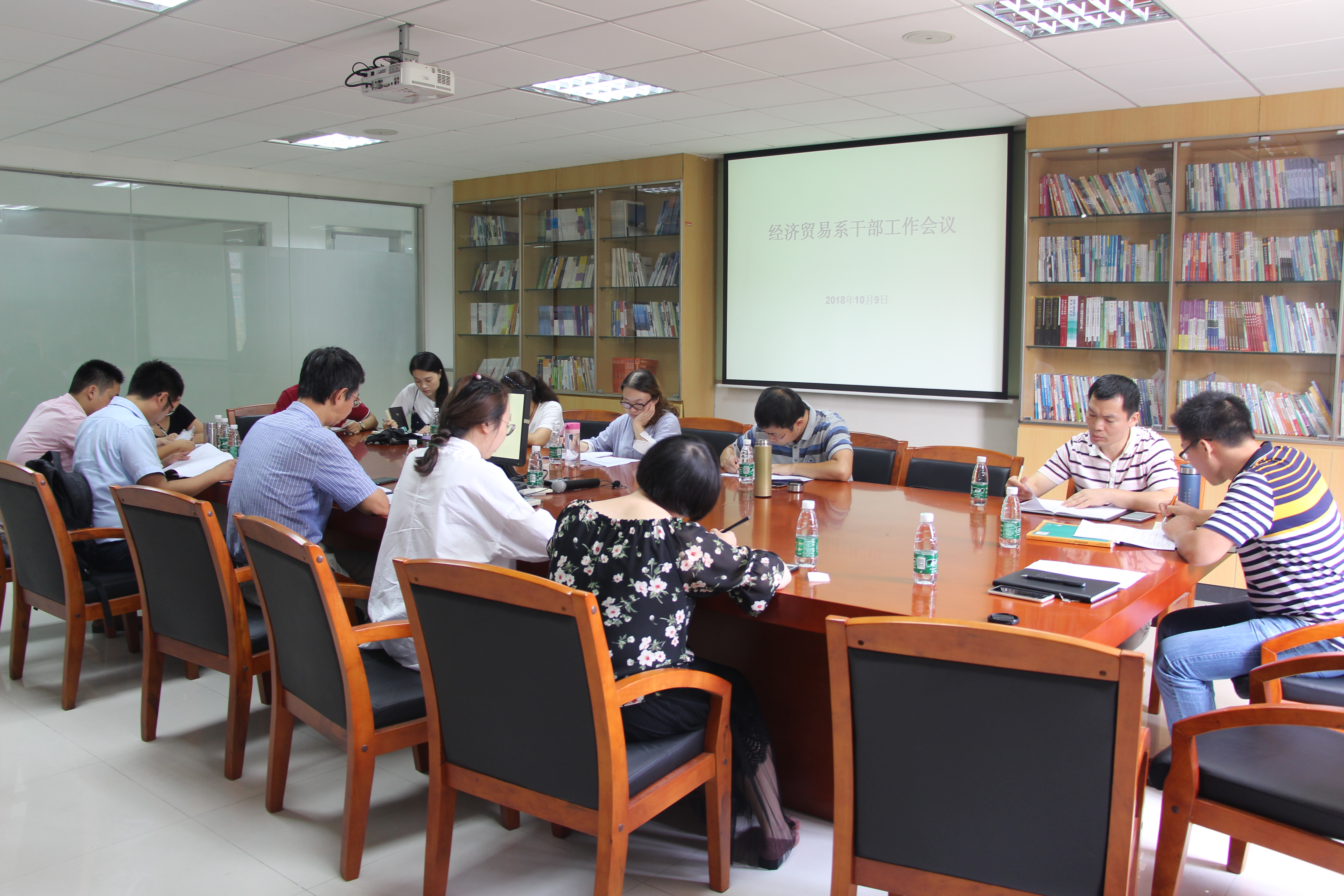 2018年10月9日下午两点,经贸系在实验楼304召开干部工作会议,系行政班子、各教研室主任、学工组长、经贸系党总支干部参加了会议,会议由系主任王学力教授主持。