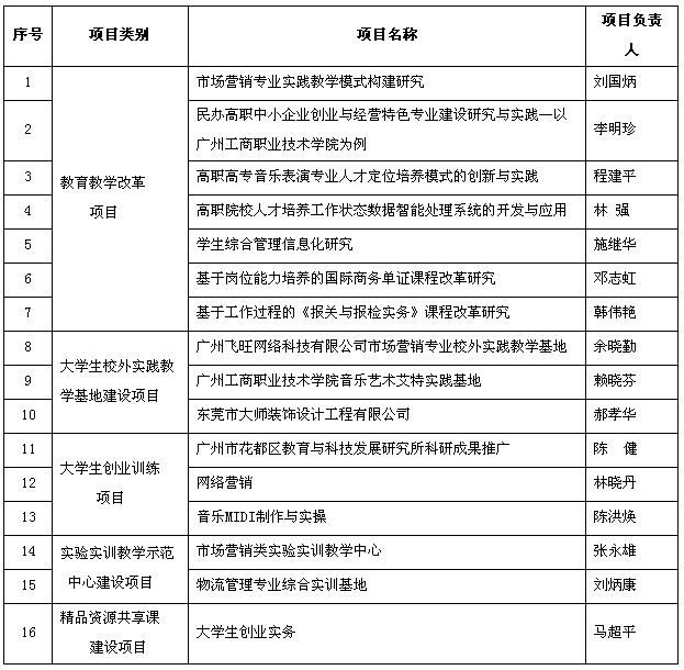 根据《关于做好2013年度院级质量工程项目申报和省级项目推荐工作的通知》(广工商院发[2013]11号)要求,各类申报项目(附件)经组织申报、资格审查、专家评审、网上公示,经院长办公会批准,现将2013年质量工程项目评审结果给予公布,并给予建设经费支持。