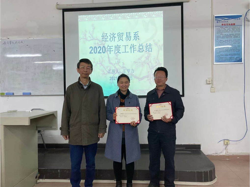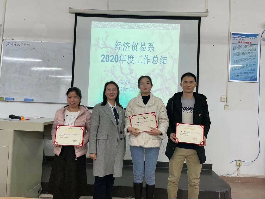 接着,对我系2020年在各项工作中表现突出的老师进行系内表彰,分别有:经济贸易系“2020年度科研先进个人” :(2人)尤彧聪、鲁朝云;经济贸易系“2020年度优秀辅导员”:(3人)杨婉君、陈冬明、耿闻捷;经济贸易系“2020年度评建工作先进个人”:(16人)潘银坪、何芬、方韵诗、张艳霞、谭晓丽、李润发、钟嘉义、魏芳、汤洁、郑国凯、易巧、陶梅、黄彩微、余柚朴、李芳斐、平永新。