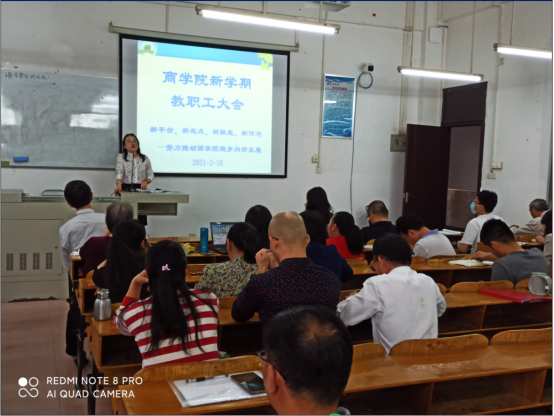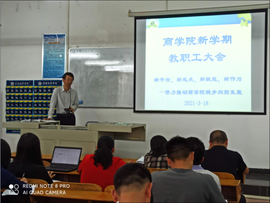2021年3月18日下午,商学院在实验楼101会议室召开“商学院新学期教职工大会”,商学院全体教职工共计124人参加本次会议。