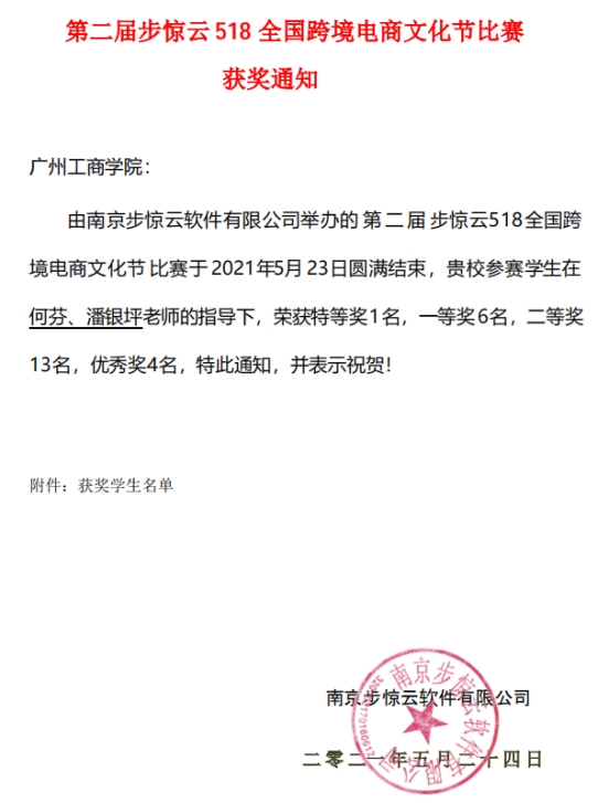 在“以德为行、以学为上”教育思想的指引下,国际经济与贸易专业积极践行“五进”教育实践活动之“进实验实训室”,与南京步惊云软件有限公司深化校企合作,将跨境电商实验实训教学与跨境电商技能大赛有机结合,积极引导学生参加第二届步惊云518跨境电商文化节比赛。