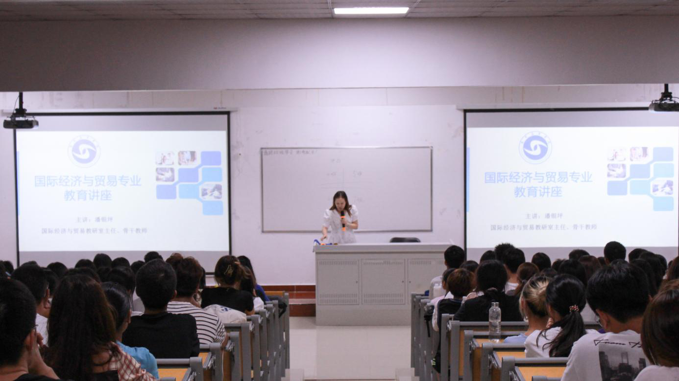 接下来潘银坪主任从三个方面对国际经济与贸易这个专业进行分析。介绍了国贸专业的专业概况与师资队伍,分析了国贸专业的行业背景,介绍了外企对相关岗位的人才需求和任职资格,例如,外贸业务员、单证员、外贸跟单员等岗位,并鼓励同学们继续深造、考取研究生,潘主任还为大家讲述该专业的培养目标、培养规格、课程体系概况等情况,从贯彻落实国标出发,紧扣社会发展的需要,培养具有国际视野、会学习、会应用、会表达、会健体、会创新的国贸应用型人才。