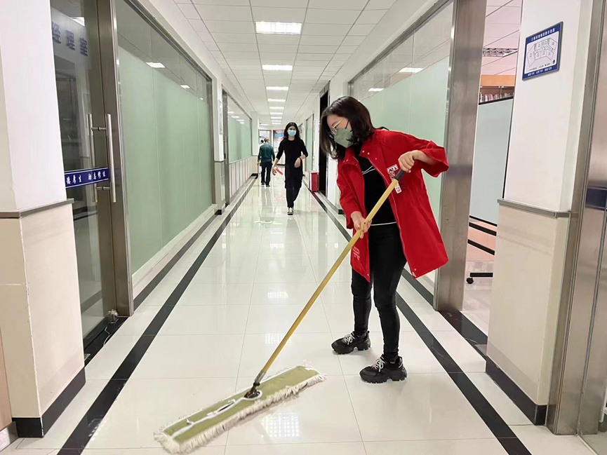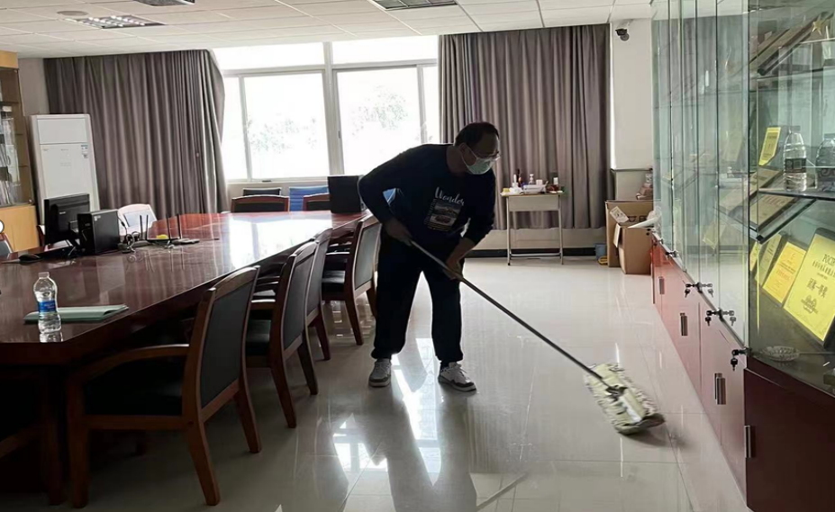 市场营销教研室老师在清扫商学院三楼过道,使地面纤尘不染,光亮如新