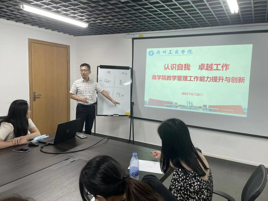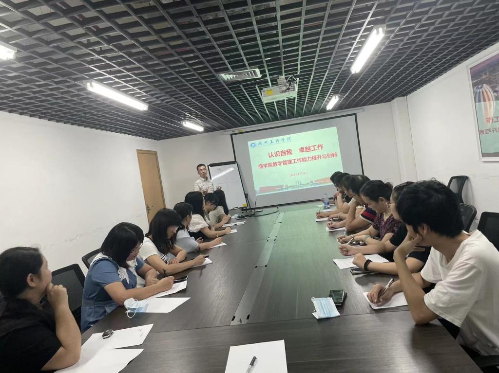 为提升学院教学管理工作人员工作能力,2022年6月25日至26日,商学院召开了主题为“认识自我,卓越工作”商学院教学管理工作能力提升与创新研讨会。学院领导、教研室主任、骨干教师等参加会议,会议由教学副院长张晓英副教授主持、副院长程振锋副教授主讲。