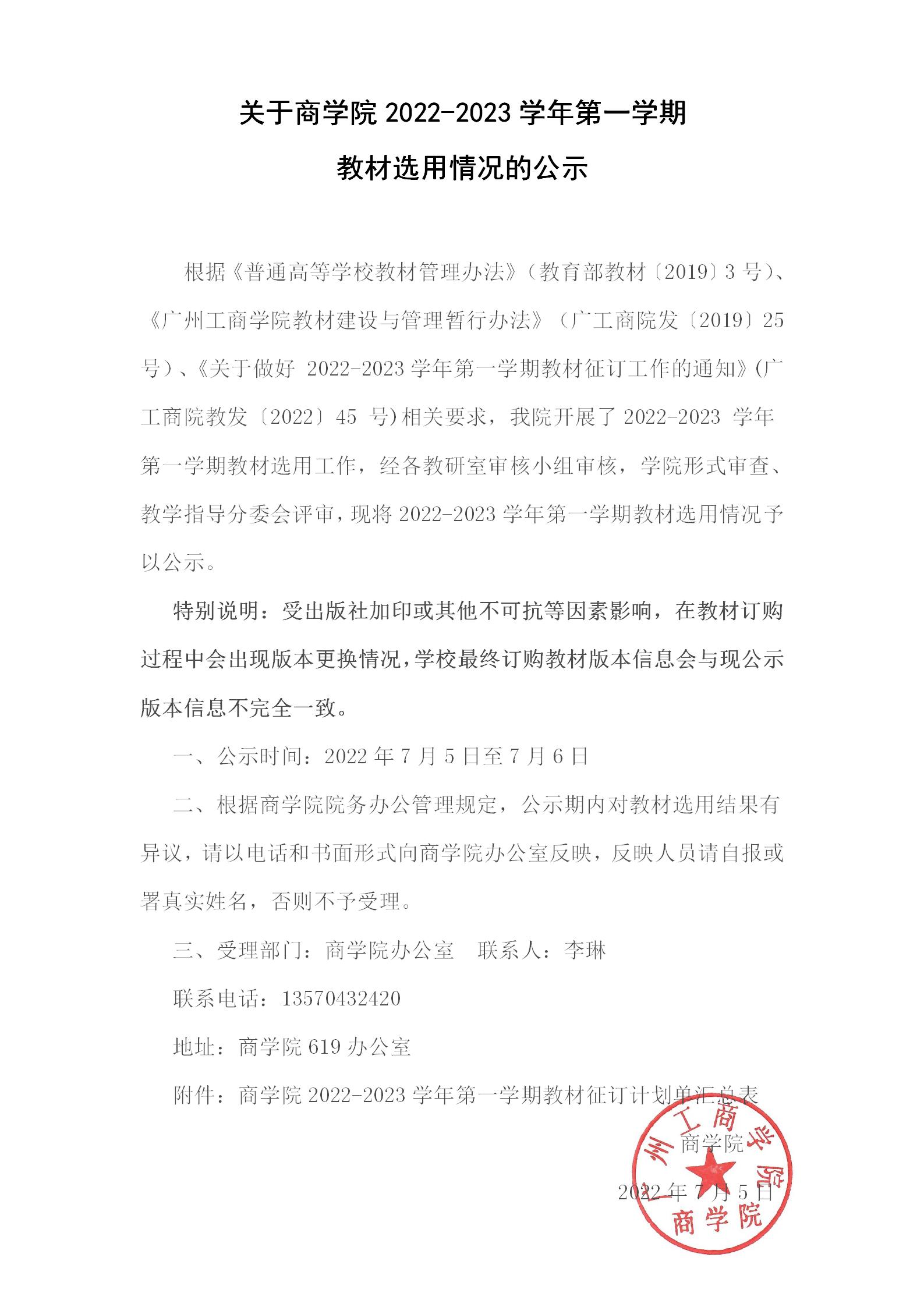 关于商学院2022-2023学年第一学期教材选用情况的公示