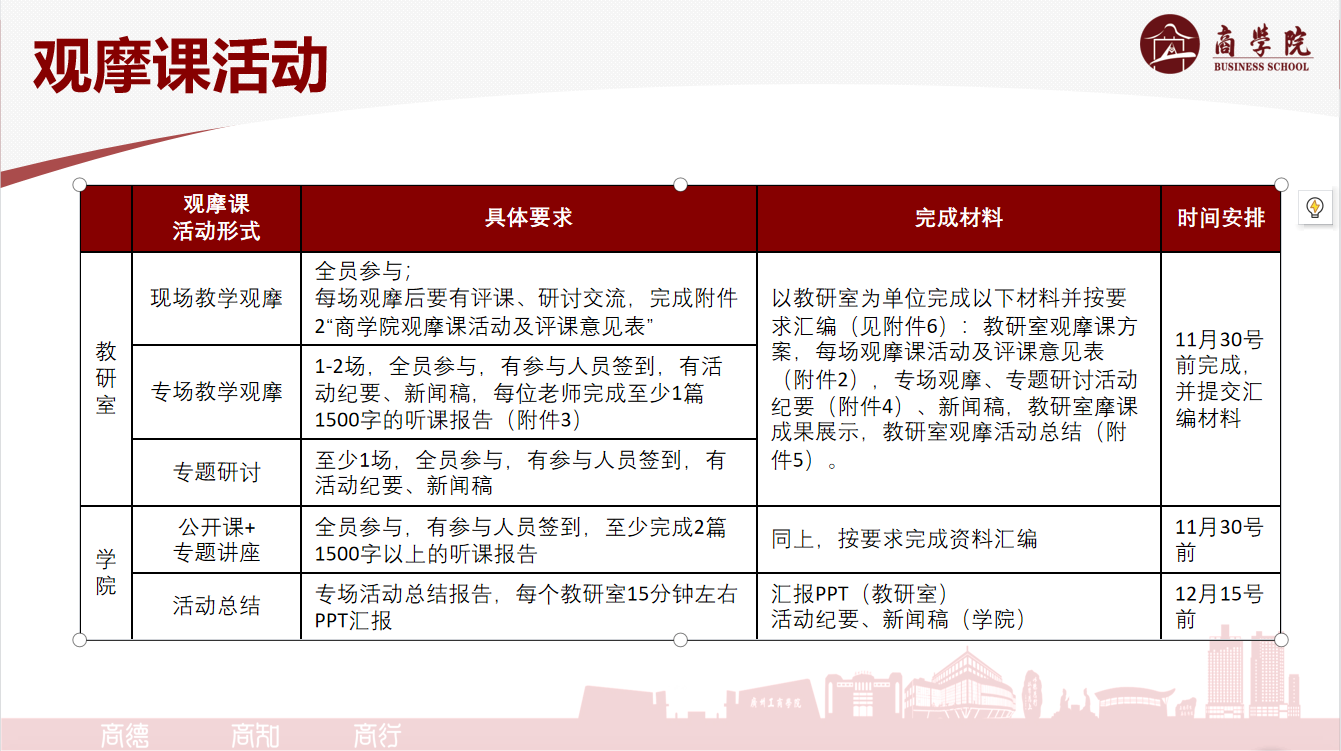 随后,赖洁瑜教授详细介绍了教师观摩课活动情况。教师观摩课活动主要涉及两个层面,教研室和学院。教研室部分包括三种形式:现场教学观摩、专场教学观摩和专题研讨。学院层面则是以公开课和专题讲座以及活动总结三部分为主,本次“磨课”活动以课程组为分类,每个课程组采用随机抽选的方法,抽取不少于三名新入职教师和一名入职一年或以上的老师进行说课活动,说课内容围绕教学对象分析、教学目标设计、重点难点分析、教学方法运用、教学评价设计等,并根据相关内容进行理论思考和策略研究,说课时间不超过二十分钟为宜。同时,每位听课教师需要拍摄1-2张听课照片,现场为说课的教师提出相关建议与评价,并做好听课记录。