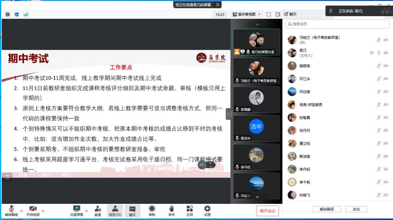 2022年10月27日,电子商务教研室开展了期中考试工作安排、观摩课活动主题会议。易巧主任以学校文件内容作为指引,针对不同部分开展了详细说明。同时易巧主任就毕业论文的相关事宜、师生图书借阅等问题也进行了传达。