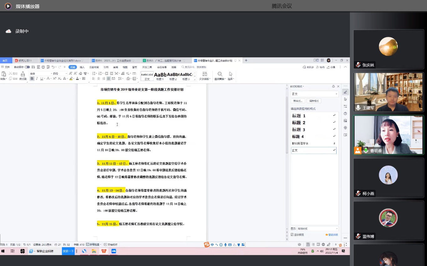 为了促进市场专业本科毕业生论文质量的提高,11月4日20:00,市场营销教研通过“腾讯会议”举行了线上2023届学生毕业论文工作布置会议。本次会议向2023届本科毕业生论文指导全体教师介绍了毕业论文的相关事项、时间安排、流程。会议由教研室主任王建军博士主持,毕业论文工作组组长曹明香讲师在会上传达了2023届学生毕业论文工作部署和安排,学术委员会委员兼主席刘美玉教授针对论文选题事项进行了指导。2023届学生毕业论文的全部指导教师参加了本次会议。