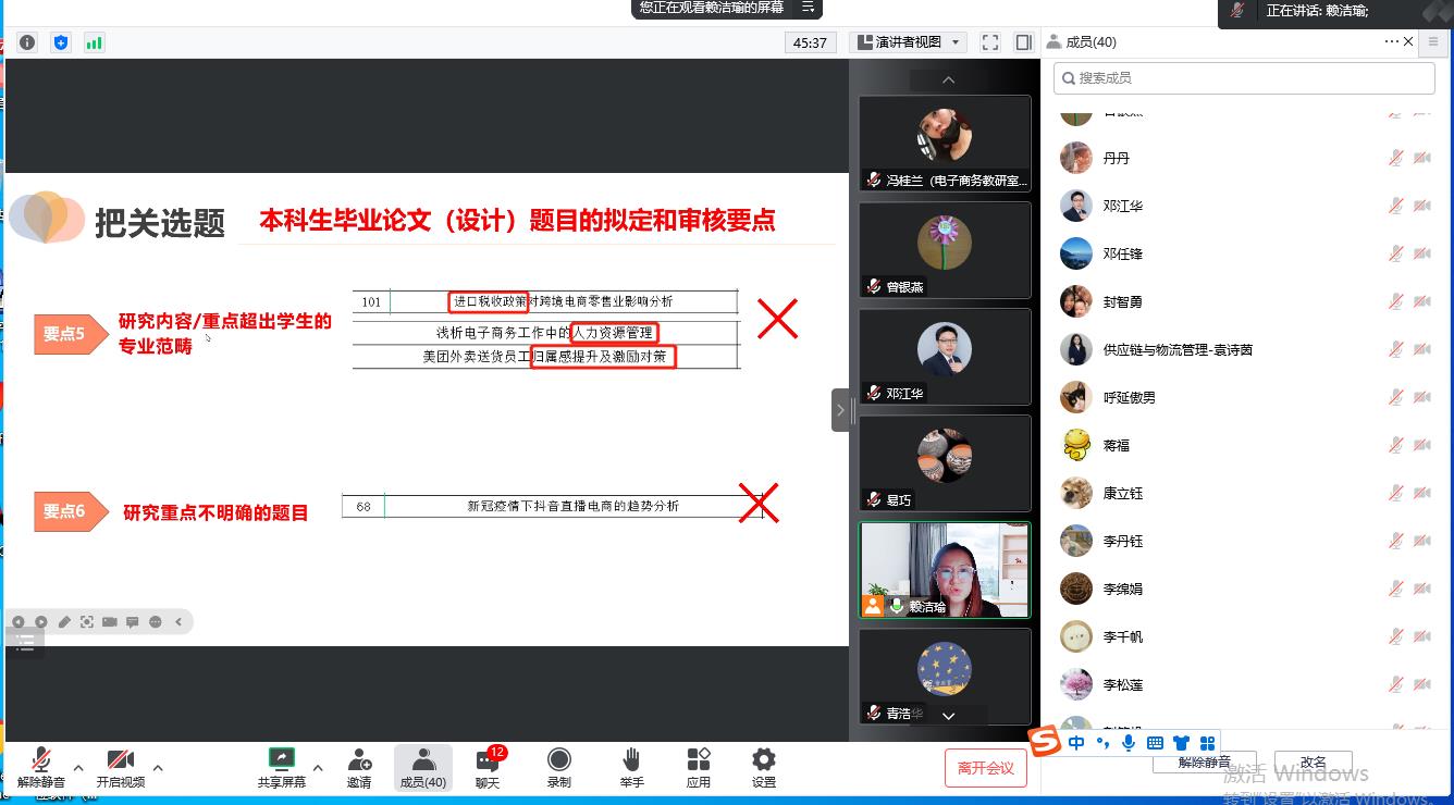 2022年11月5日21:30-23:30,电子商务专业紧急召开2023级毕业论文指导工作主题会议,首先易巧主任就毕业论文工作机制、学术委员会等相关事宜做出安排。随后由赖洁瑜教授就论文指导工作为教师们提供相关的培训并提出相关意见和建议。在论文工作中,选题是最初的起点也是最关键的部分,因此本科生毕业论文(设计)题目确定的原则包括五点:一是反映论文的核心内容;二是做到言简意赅,用最少的字数表述最清晰的含义;三是符合学术表达规范;四是吸引眼球,紧跟当前形势、立意高远;最后是使用本领域的确定性词语。