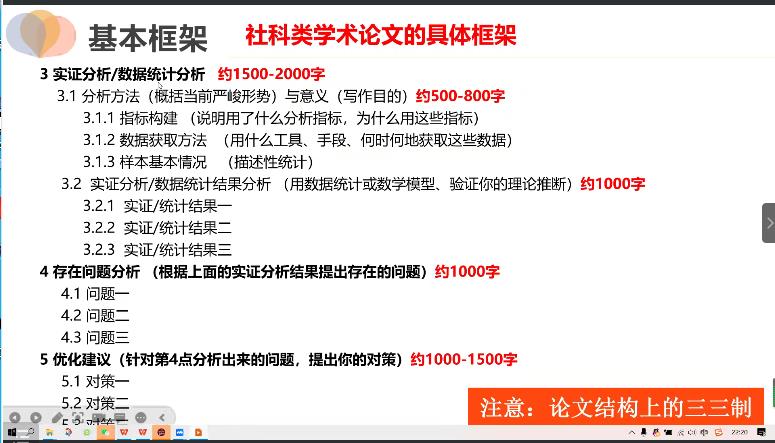 随后,赖教授详细陈列了社科类学术论文的基本框架,分享了指导毕业论文的工作经验,从具体的案例出发解释说明各类论文的不足与修改建议,最后希望各位老师严格要求学生开展论文指导工作,共同促进学生成长成才,顺利毕业。