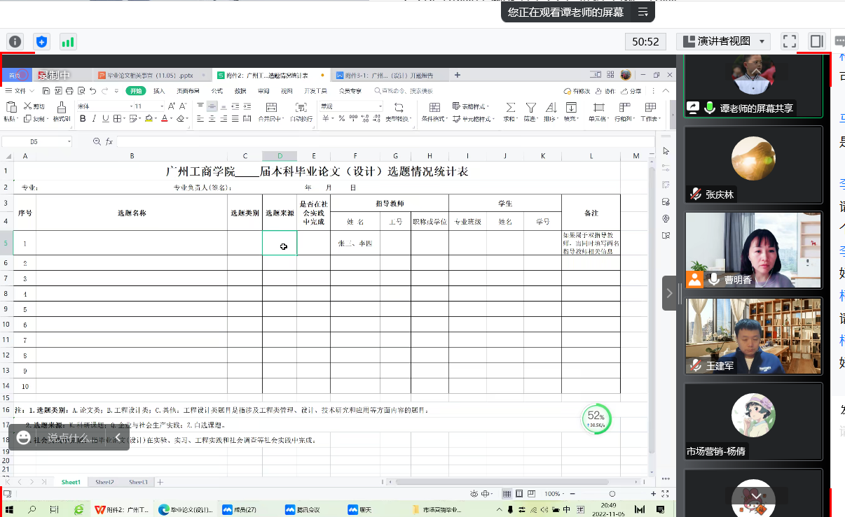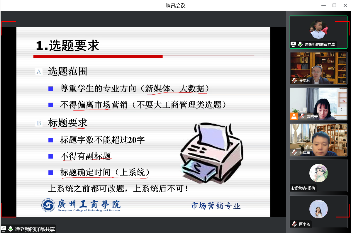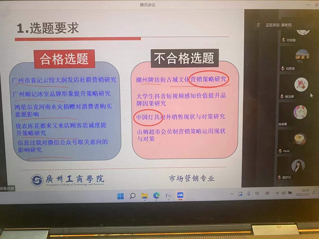 为提高学生毕业论文(设计)质量水平,推动本科毕业论文(设计)的规范化,11月5日,市场营销教研室组织召开了本科毕业生论文选题及论文操作系统培训会。本次培训会在腾讯会议上进行,由曹明香老师主持,谭晓丽副教授主讲。市场营销教研室全体本学期心老师和部分有经验的教师共27人参加了本次培训会。