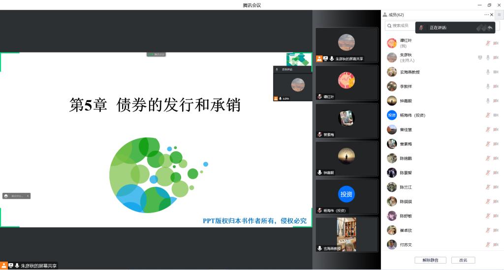 教师的专业发展离不开“专业引领、同伴互助和实践反思”,而观摩课活动正是这三位一体的重要体现。为进一步加强教师之间的教学交流,锤炼教学基本功,帮助教师提升教育教学基本功,推动备课、上课、评课、议课、再上课教学全过程的形成,2022年11月15日下午,商学院投资学教研室组织了线上教学观摩活动。专业观摩课活动主讲人是朱彦秋老师,课程为《投资银行学》,教研室全体教师参加了本次活动。