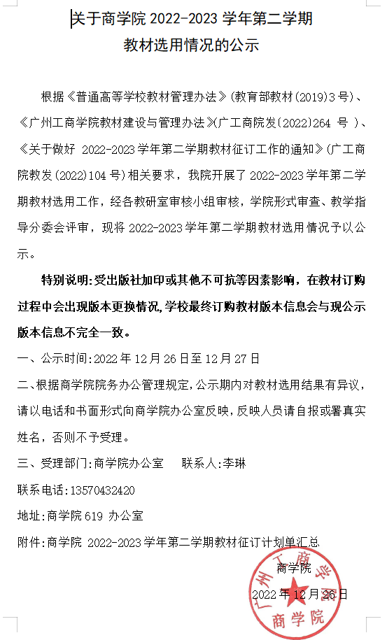 关于商学院2022-2023学年第二学期教材选用情况的公示