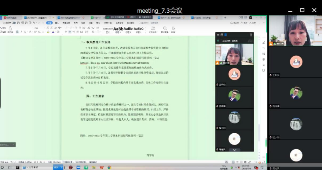 临近期末,为有序开展期末考试工作,按时完成各项教学任务,7月3日晚上9点,市场营销教研室在腾讯会议召开了学期期末考核资料整理收集工作说明会,会议由教研室副主任曹明香老师主持。市场营销教研室全体教师参加了此次会议。