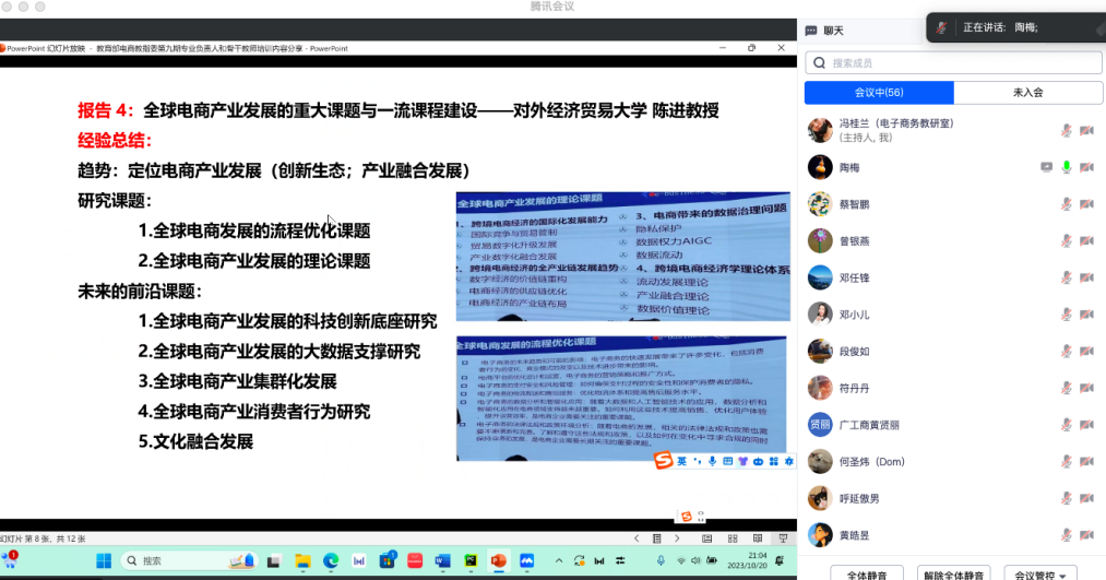 2023年10月11-13日,由教育部高等学校电子商务类专业教学指导委员会(以下简称“电商教指委”)主办,华中师范大学承办,武汉工程大学、武汉工商学院协办的2023年全国电子商务专业负责人和骨干教师培训班在武汉成功举行,本次培训旨在全面推进本科教育教学改革试点工作的组织实施,推动高等学校电子商务类国家一流专业与一流课程建设。ky开元商学院电子商务教研室骨干教师陶梅副教授参加了此次培训,并于2023年10月20日在电子商务教研室内开展了别开生面的培训分享会。