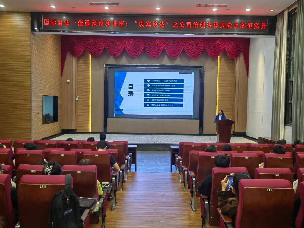 本次讲座采取案例解析与互动讨论相结合的形式,旨在帮助学生全面理解公司从设立到注销过程中存在的法律风险,并结合涉外法律实务,对国际商法与贸易实务感兴趣的学生深受裨益,获得学生的热烈反响与好评。