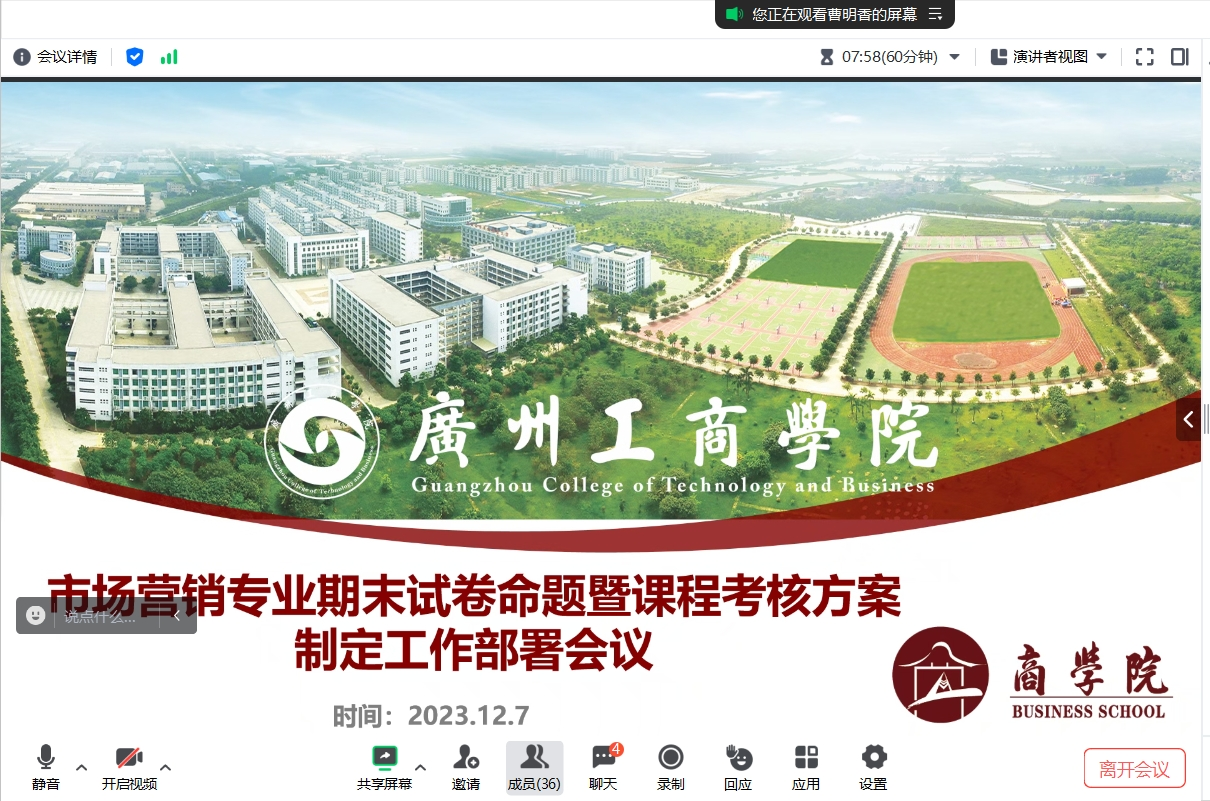 为进一步规范课程考核管理,更好地做好本学期期末考试命题工作,根据学校课程考核管理办法相关文件的要求,市场营销教研室于2023年12月7日晚上在腾讯会议室举行线上会议,以期末试卷命题暨考核方案制作为主题,重点研讨了2023-2024学年第一学期期末试卷命题质量暨课程考核方案制作专项会议。会议由市场营销教研室副主任曹明香老师主持,市场营销教研室全体教师参加了本次会议,