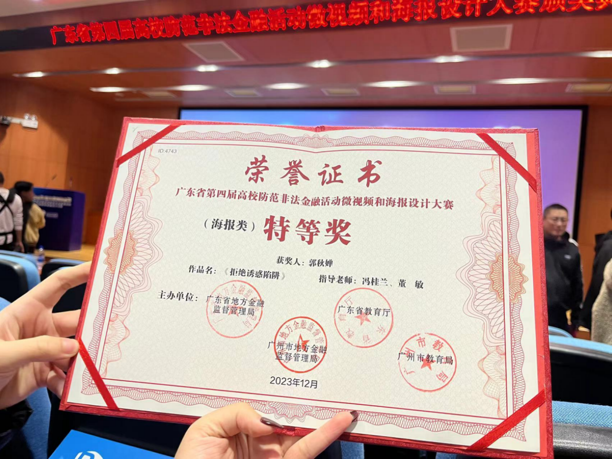 广东省第四届高校防范非法金融活动微视频和海报设计大赛于12月21号圆满落幕。商学院电子商务教研室冯桂兰老师、董敏老师指导的学生郭秋婵的《拒绝诱惑陷阱》作品在众多优秀作品中脱颖而出,荣获特等奖并获得奖金10000元。同时,冯桂兰老师和董敏老师也荣获最佳指导老师的殊荣称号。